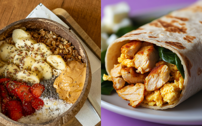 Fill a whole-grain wrap with sliced turkey or chicken breast, scrambled eggs, and spinach.